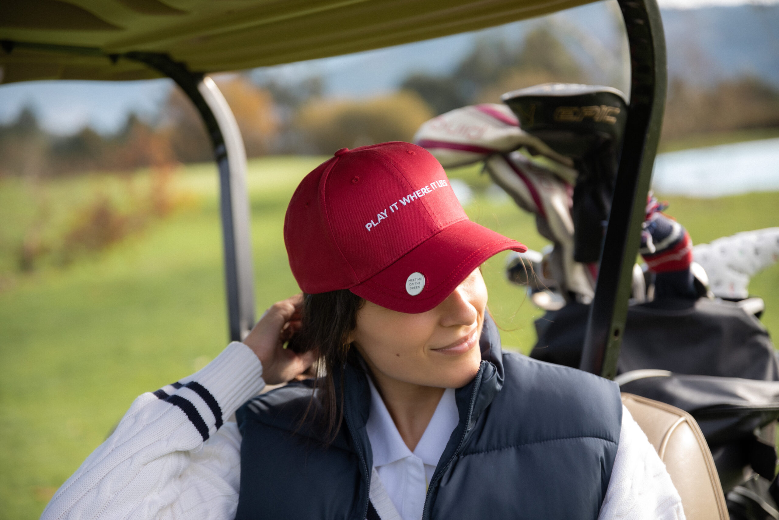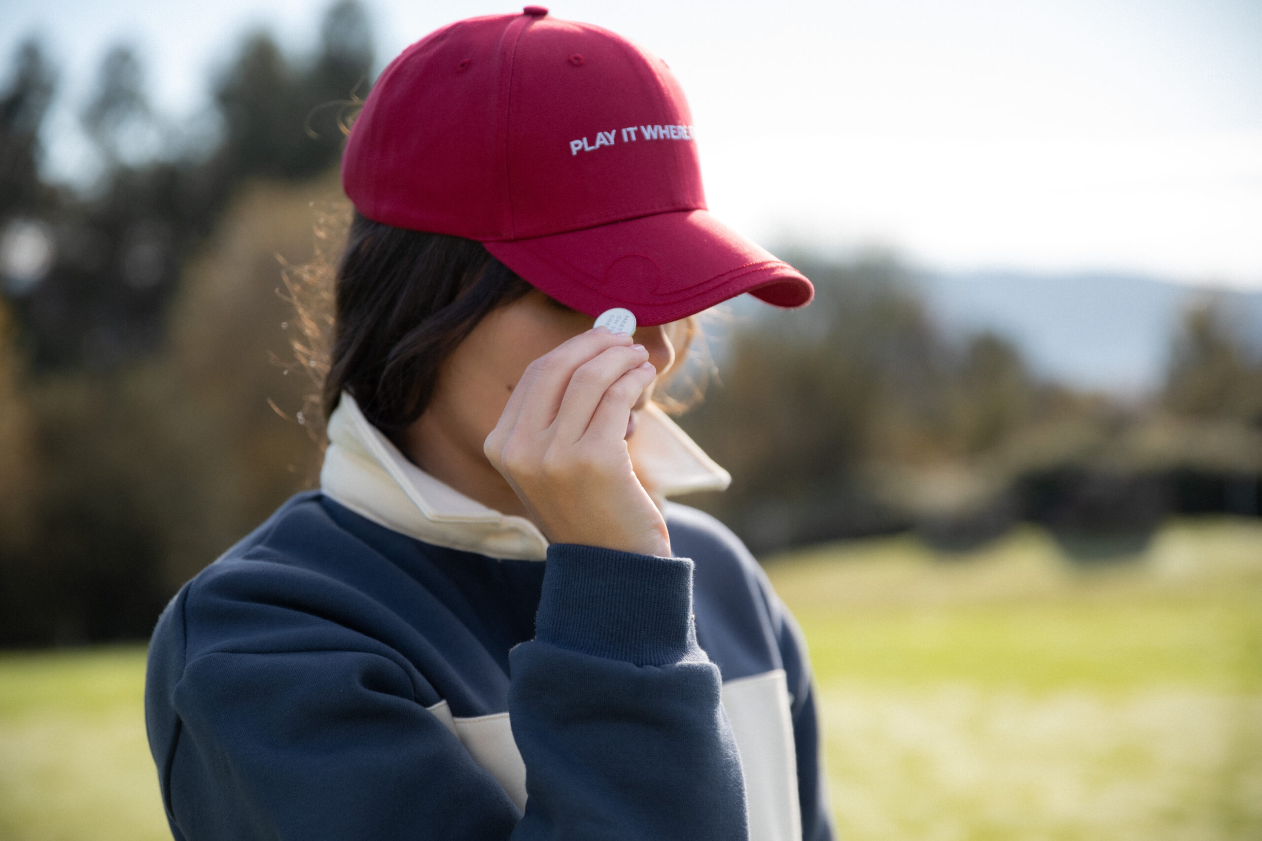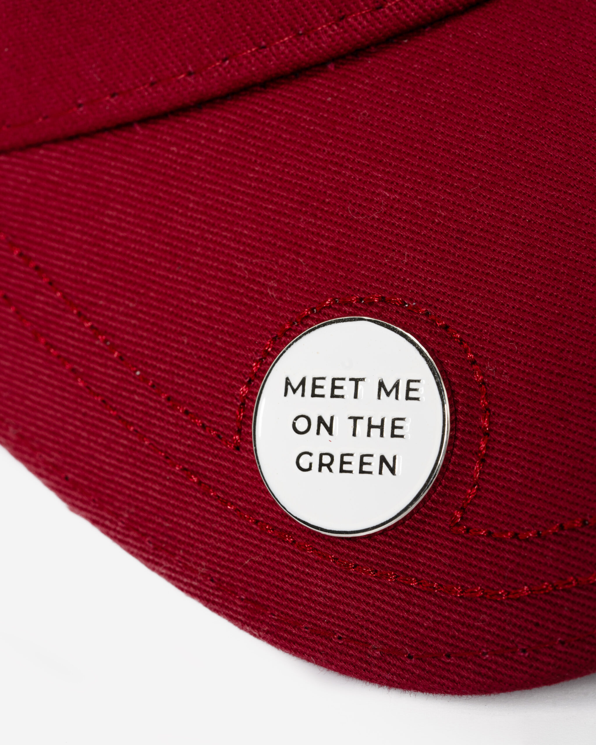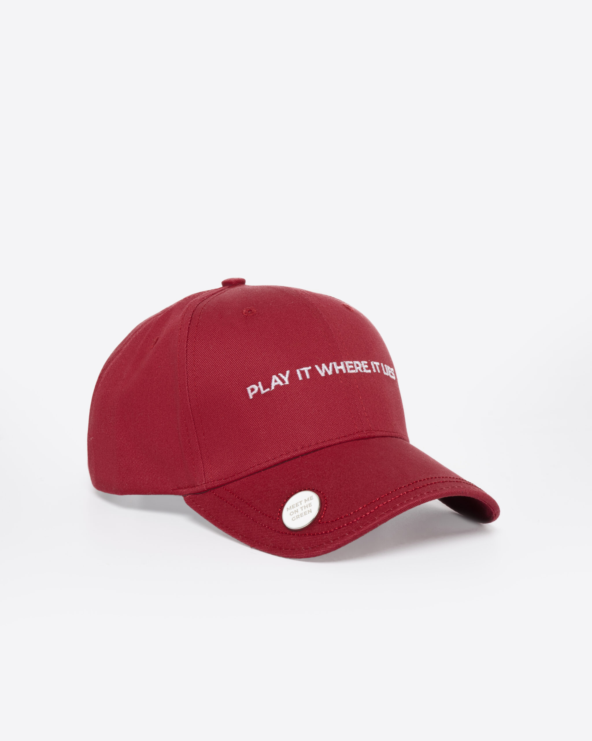 Burgundy cap with an integrated magnetic ball marker. Sophistication, character and functionality in a single piece.